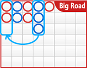 Abajo:Compara las anteriores dos filas anterior es en manera de transversal según los resultados últimos de Gran Camino, de cualquier resultado de banquero o jugador, pinta el punto rojo en Pequeño Camino.