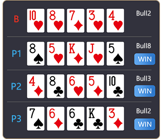 - Card Types: 5P(5 J、Q、K) > Bull Bull > Bull9 > Bull8 > Bull7 > Bull6 > Bull5 > Bull4 > Bull3 > Bull2 > Bull1 > No Bull