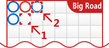 - Based on the latest results of Big Road, compare the number of results in previous 2 columns. If both columns are the same, then a red hollow circle is drawn. if both columns number of records are not the same, then a blue circle is drawn.