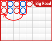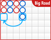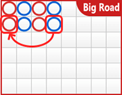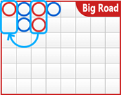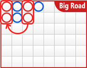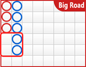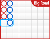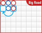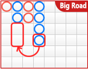 Go down:Based on the latest results of Big Road, comparing the position of current result with previous column, if there is no record in the previous column on the same row, then a blue.