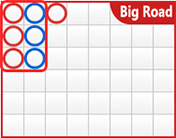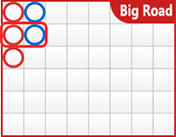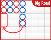 Go down:Based on the latest results of Big Road, compare current column and row with previous column and row. If previous column and row contains result (Banker/Player), then a red