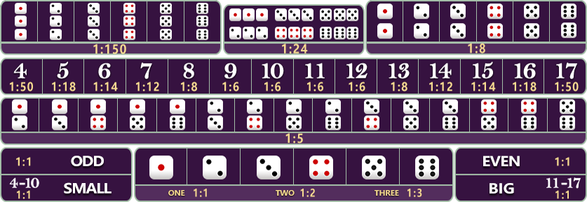 | Odd | 1 pays 1 | Total Dice points 5, 7, 9, 11, 13, 15, 17 ( In the event that any triple comes out : all bets wagered on the portion loses. ) |