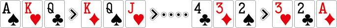 A > K > Q > J > 10 > 9 > 8 > 7 > 6 > 5 > 4 > 3 > 2 ,the card suit does not affect the card rank.